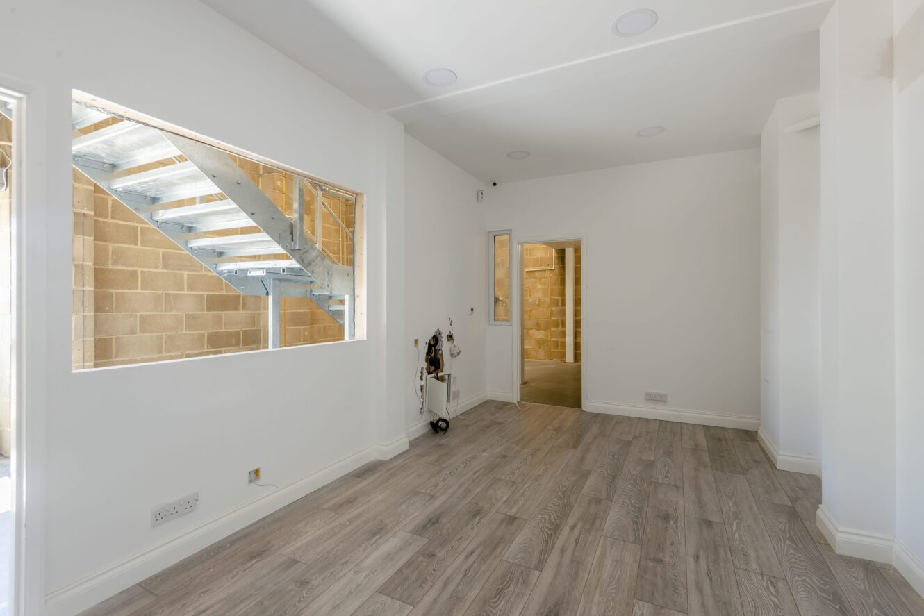 The property is a single storey terraced light industrial unit of brick build with a profiled metal sheet cladding roof. The unit has a full height roller shutter door, pedestrian entrance and currently has a first floor mezzanine. There is a single WC and small kitchen area as constructed. The eaves height is approximately 4.79 m